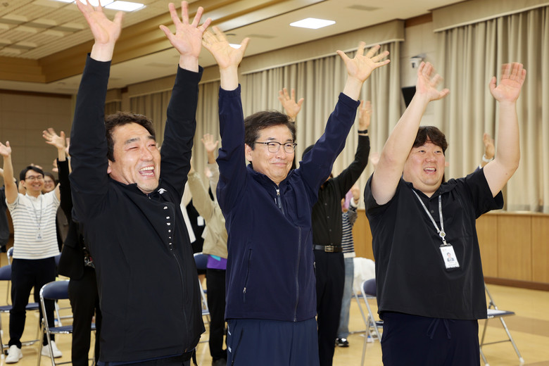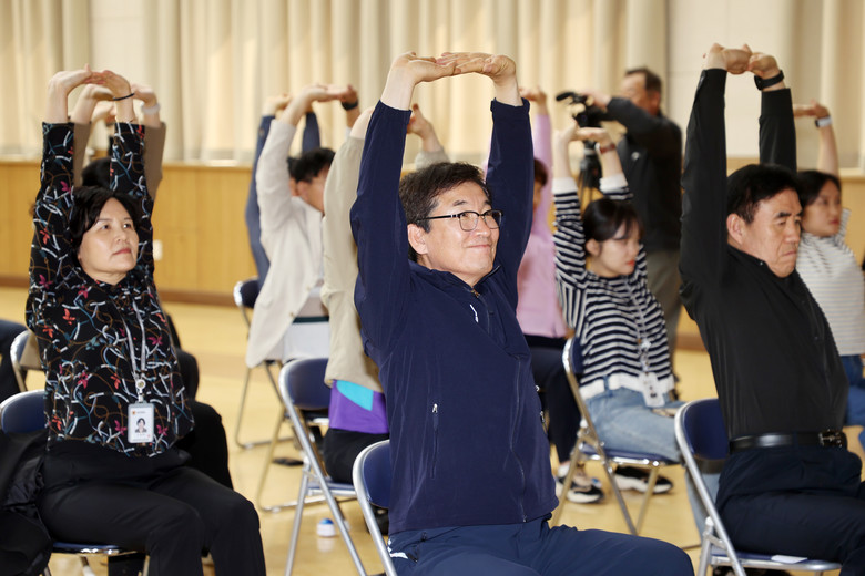 [충북 세계타임즈=이현진 기자] 윤건영 충청북도교육감은 2일(금), 도교육청 화합관에서 도교육청 직원들과 함께 건강지킴이 활동에 함께 참여하며 근무 중에 잘못된 자세 등으로 생기는 통증을 완화하는 운동법을 배우며 담소를 나누는 시간을 가졌다.