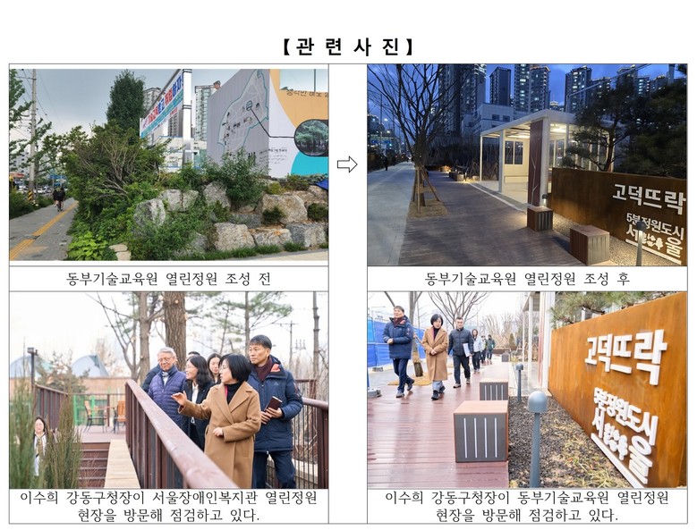이번 사업을 통해 구는 동부기술교육원 담장을 후퇴시켜 유휴공간을 확보하고, 산책로와 휴게공간을 조성했다. 또한 계절감을 느낄 수 있는 수목과 초화를 식재해 밝고 개방감 있는 가로경관을 갖춘 정원으로 재탄생시켰다. 그 결과, 주민들은 그동안 활용도가 낮았던 공공시설과 도로 사이의 공간 대신 누구나 일상 속에서 잠시 머물러 쉬어갈 수 있는 열린정원으로 이용할 수 있게 됐다.